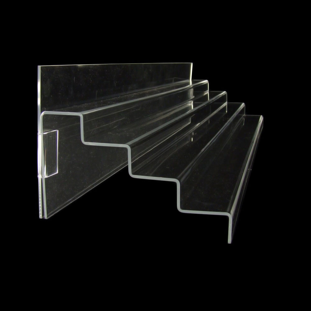 Beschreibung: Dekotreppe (Acryltreppe) mit vier Stufen,Stufe 3 cm hoch und 5 cm tief, Kanten poliert, mit Rückwand 170 mm hoch